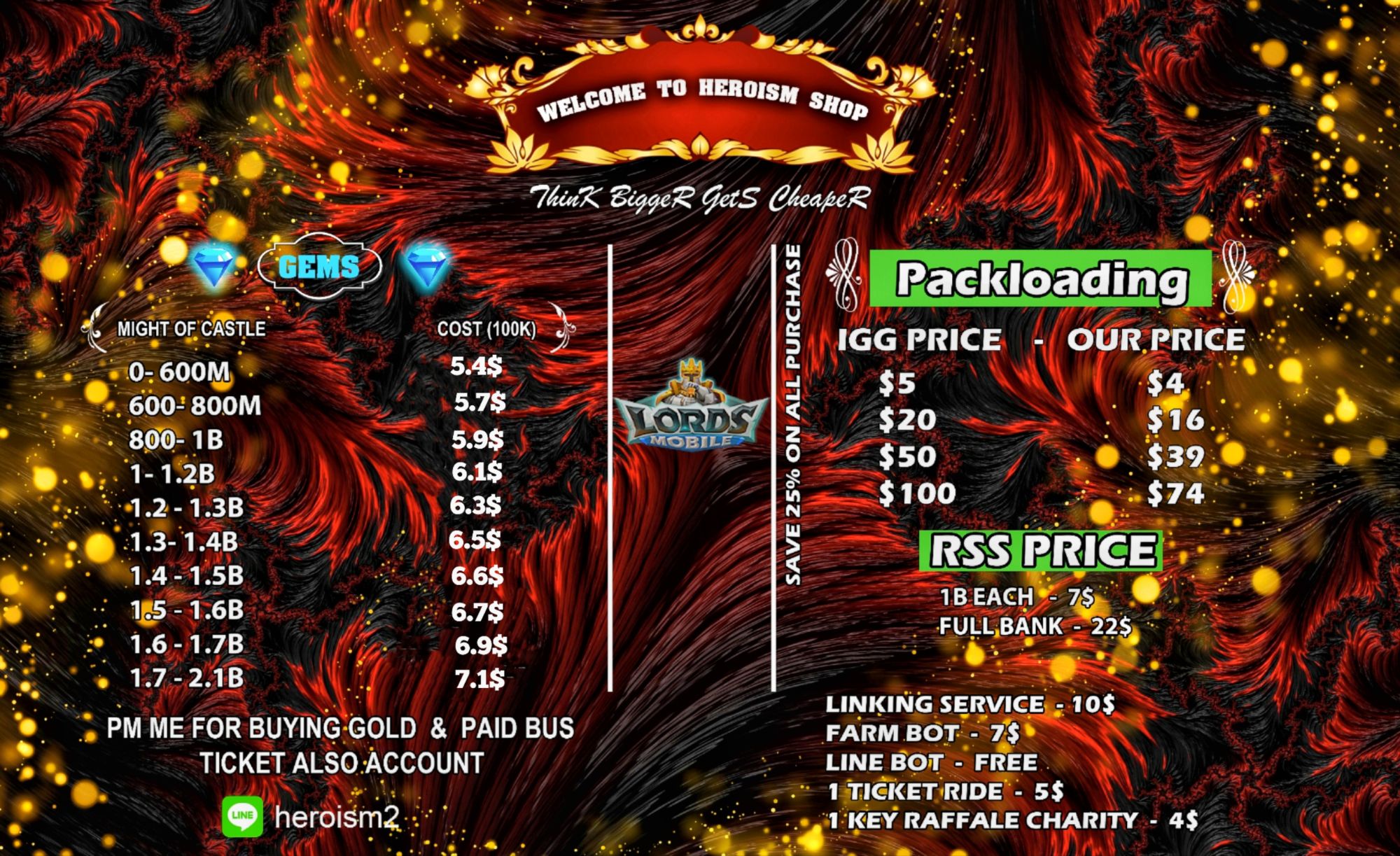 Welcome to Heroism Shop I m the Owner of Heroism Shop We Provide Mm Service And Account ~ Gems π & Rss Also i m WoW Hopping Owner And Give Line Bots Free Also Provide War Bot & Diamond Pm Me For All Service You Already Know Us Heroism People Call Us As Real Hero 24*7 Support With Live Chats!