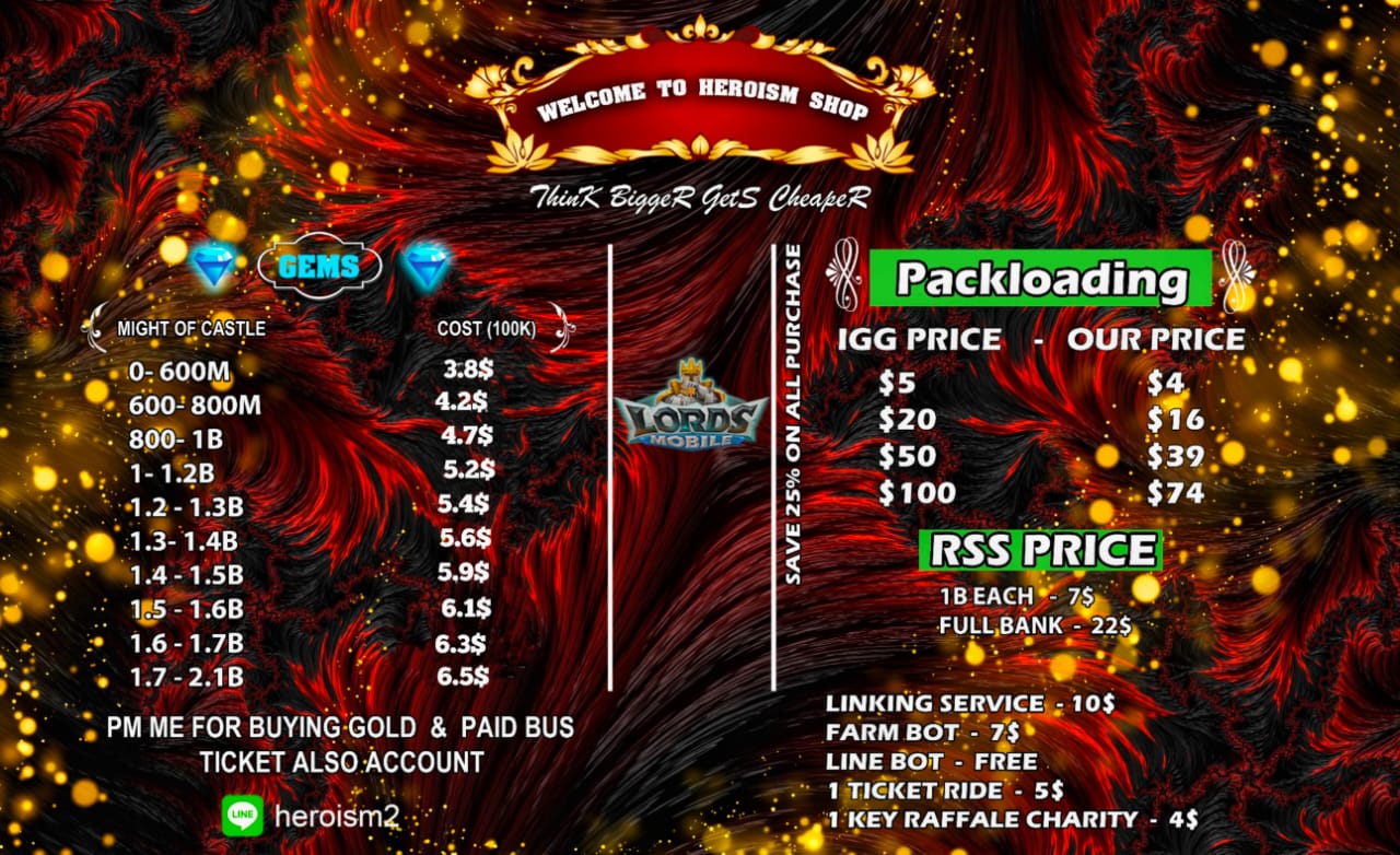 Welcome to Heroism Shop I m the Owner of Heroism Shop We Provide Mm Service And Account ~ Gems π & Rss Also i m WoW Hopping Owner And Give Line Bots Free Also Provide War Bot & Diamond Pm Me For All Service You Already Know Us Heroism People Call Us As Real Hero 24*7 Support With Live Chats!